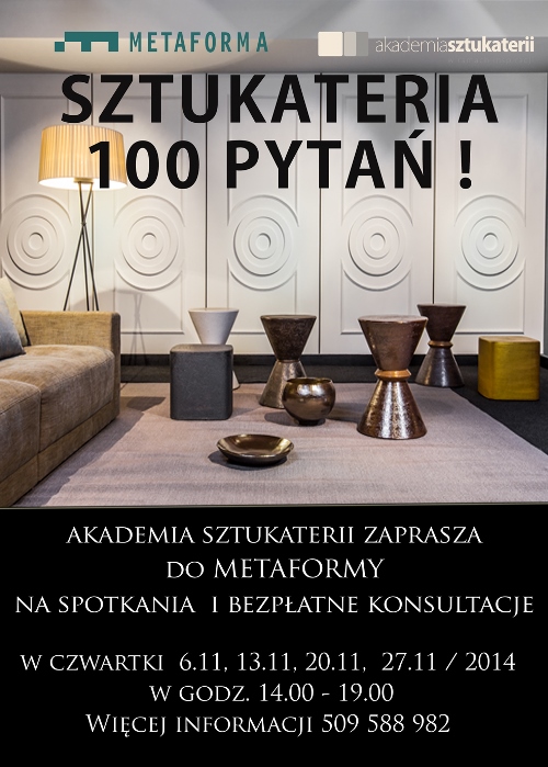 Akademia sztukaterii zaprasza do udziału w bezpłatnych spotkaniach zatytułowanych „Sztukateria 100 pytań” do krakowskiego salonu METAFORMA przy ul. Wrocławskiej 28. Konsultacje i porady dotyczące zastosowania sztukaterii będą odbywać się w każdy listopadowy czwartek, w godzinach od 14:00 -19:00. Na spotkania zapraszamy architektów, projektantów, wykonawców remontów, miłośników pięknych wnętrz oraz osoby poszukujące inspiracji do odmiany swoich domów i mieszkań.